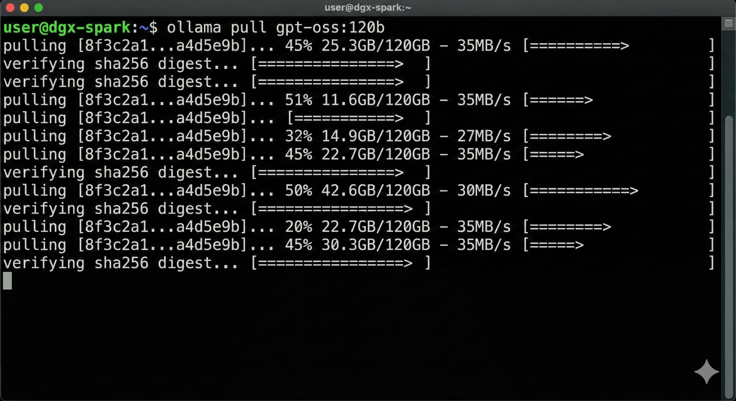 หลังจากการติดตั้งเสร็จสิ้นและบริการของ Ollamaเริ่มทำงาน ขั้นตอนต่อไปคือการดาวน์โหลดโมเดล AI ที่คุณต้องการมาใช้งาน สำหรับคู่มือนี้เราขอแนะนำโมเดล GPT-OSS 120B ซึ่งเป็นโมเดลที่มีขนาดใหญ่และมีความสามารถสูงในการเขียนโค้ด คุณสามารถดาวน์โหลดโมเดลนี้ได้โดยใช้คำสั่ง ollama pull gpt-oss:120b โปรดทราบว่าขั้นตอนนี้อาจใช้เวลาสักครู่เนื่องจากไฟล์โมเดลมีขนาดใหญ่ แต่เมื่อดาวน์โหลดเสร็จแล้วคุณก็พร้อมที่จะใช้งาน AI ผู้ช่วยที่ทรงพลังบนเครื่องของคุณได้ทันที