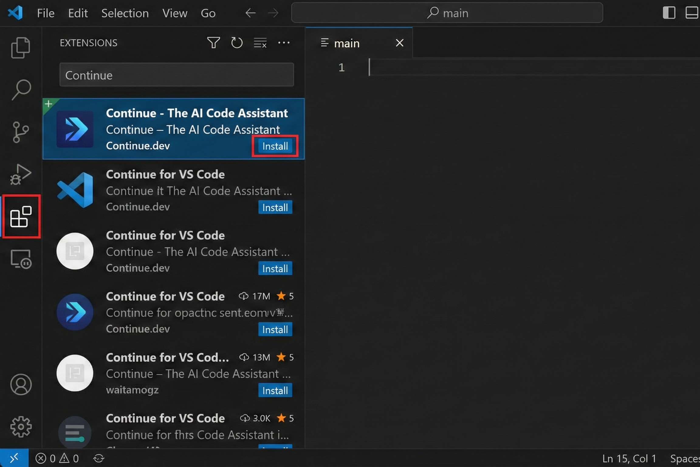 เมื่อติดตั้ง VSCode เรียบร้อยแล้ว ขั้นตอนถัดไปคือการติดตั้งส่วนขยาย Continue.dev ซึ่งจะทำหน้าที่เป็นตัวกลางเชื่อมต่อระหว่าง VSCode และ Ollama ให้เปิดโปรแกรม VSCode แล้วไปที่ส่วนของ Extensions จากนั้นค้นหาคำว่า Continue ที่จัดทำโดย Continue.dev และกดติดตั้ง เมื่อติดตั้งเสร็จแล้วจะมีไอคอนของ Continue ปรากฏขึ้นที่แถบด้านขวา คลิกที่ไอคอนนั้นเพื่อเริ่มต้นใช้งาน ซึ่งส่วนขยายนี้จะช่วยให้คุณสามารถส่งคำสั่ง (Prompt) ให้ AI เขียนโค้ดหรืออธิบายโค้ดให้คุณได้โดยตรงในหน้าต่างแก้ไขโค้ด