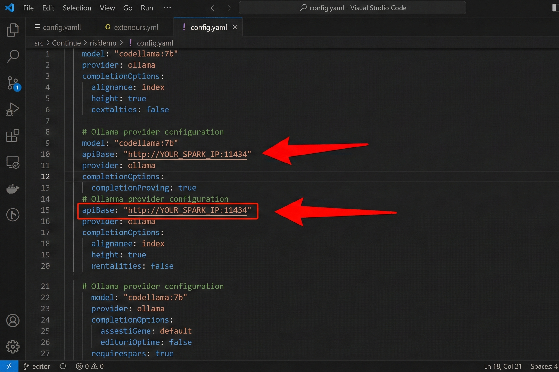 เมื่อเข้าสู่หน้าตั้งค่า ให้คลิกที่ไอคอนฟันเฟืองข้างช่องเลือกโมเดลภายใต้ส่วนของ Chat ไฟล์ config.yaml ของ Continue จะถูกเปิดขึ้นมา ให้คุณทำการแก้ไขไฟล์นี้โดยระบุ IP Address ของเครื่อง DGX Spark และพอร์ต API ให้ถูกต้อง โดยแทนที่ค่าต่างๆ ในไฟล์การตั้งค่าให้ชี้ไปยัง http://YOUR_SPARK_IP:11434 ซึ่งจะทำให้ VSCode บนเครื่องอื่นสามารถส่งคำสั่งไปประมวลผลที่ DGX Spark และรับผลลัพธ์กลับมาได้
